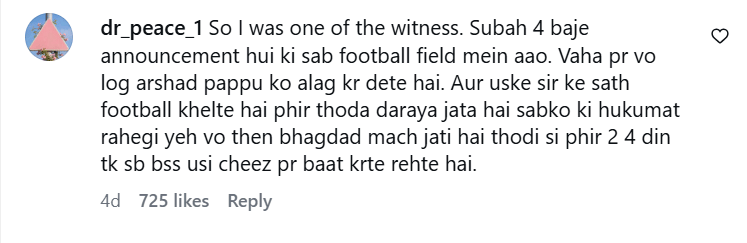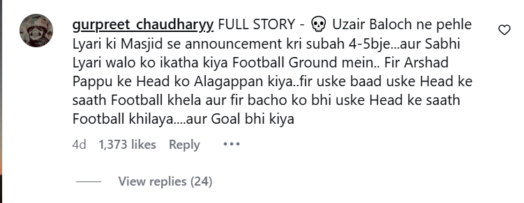 इस पोस्ट के कमेंट में वहां के कई लोगों ने इस घटना के बारे में बताया है। मारिया नाम की एक यूजर ने लिखा, 'अरशद पप्पू को मार दिया गया, फिर उजैर बलोच के गैंग ने उसका सिर कलम किया। इसके बाद अगली सुबह अनाउंस किया गया कि ल्यारी में कल फुटबॉल मैच है और सबको आना है।