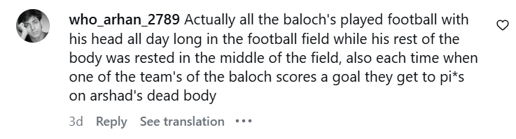 वहां अरशद पप्पू के सिर से फुटबॉल खेली गई।' तैमूर नाम के एक यूजर ने लिखा, 'सुबह 4 बजे मस्जिद में ऐलान होता है कि सब लोग फुटबॉल ग्राउंड में जमा हो जाओ और सब लोग आते हैं। वहां उजैर बलोच और उसके साथी अरशद पप्पू के सिर से फुटबॉल खेलते हैं।'