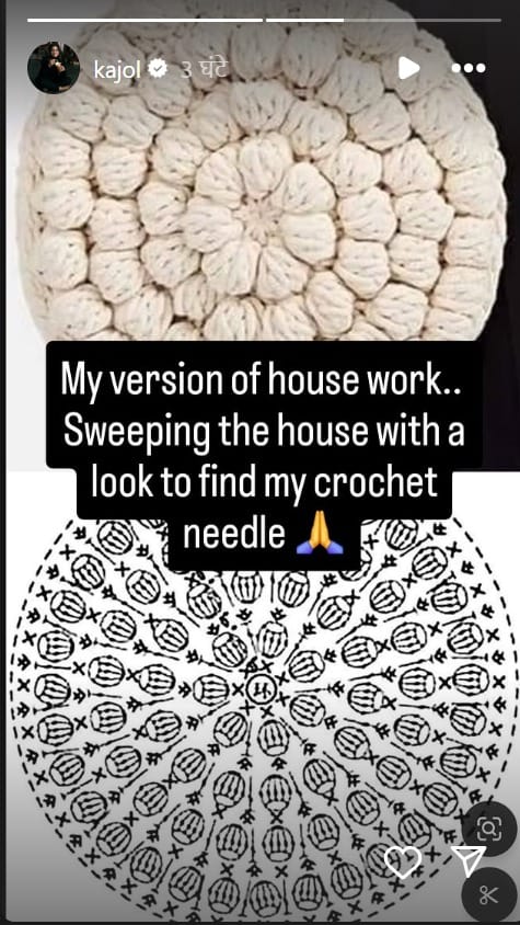 काजोल को क्रोशिया की बुनाई बहुत अच्छी तरह आती है। पहले भी वे यह बात फैंस के साथ साझा कर चुकी हैं। आज मंगलवार को उन्होंने इंस्टाग्राम पर पोस्ट शेयर की है। उन्होंने क्रोशिया आर्ट के नमूनों की झलक दिखाई है, जिन्हें खुद काजोल ने बुना है। इसके साथ उन्होंने लिखा है, 'मेरा घरेलू काम करने वाला वर्जन। अपनी क्रोशिया सलाई खोजते हुए इन पर नजर पड़ी'।