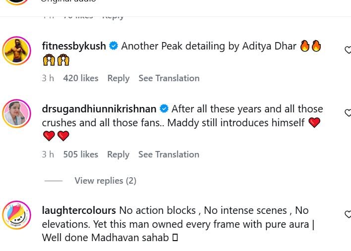 माधवन ने कहा है, 'आदित्य धर इन सब चीजों का बहुत ख्याल रखते हैं। उन्होंने मुझसे कहा था कि ये लाइन बोलते वक्त इससे बहुत पहले सिगरेट बुझा दीजिएगा। आपके मुंह से न ही धुआं निकलेगा, न ही स्क्रीन पर धुआं दिखेगा, न ही आपके हाथ में सिगरेट होगी, क्योंकि यह हमारे लिए बहुत ही पवित्र है। मैंने बाकायदा सिगरेट बुझा दी थी। उसके बाद अगर आप सीन को देखेंगे तो आपको यकीन हो जाएगा कि न ही मेरे मुंह से धुआं निकल रहा है, न ही फ्रेम में कहीं सिगरेट का धुआं है। न ही सीन के पूरा होने तक सिगरेट का नामो-निशान है'।