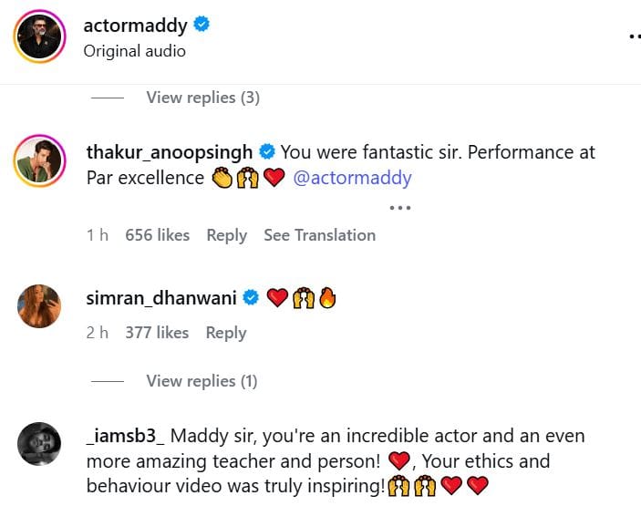 माधवन ने आगे कहा है, 'हमें पता है कि हम अनजाने में भी किसी का दिल नहीं दुखाना चाहते। हम पूरे सिख समुदाय के साथ हैं। हमेशा रहेंगे। उनका बहुत आदर करते हैं। हर फिल्म की रिलीज से पहले मैं खुद स्वर्ण मंदिर जाता हूं, यह सबको पता है। किसी को ठेस पहुंचाने का हमारा कोई इरादा नहीं था। न ही हमने ऐसा किया है। सीन के शुरुआत में मेरे हाथ में सिगरेट है, लेकिन जब वह सीन शुरू होता है तो मैं बाकायदा सिगरेट बुझा देता हूं'। माधवन ने आगे कहा है, 'किसी को जाने-अनजाने में बुरा लगा है तो माफ कीजिएगा'। पोस्ट पर नेटिजंस माधवन की तारीफ कर रहे हैं और उनका समर्थन कर रहे हैं।