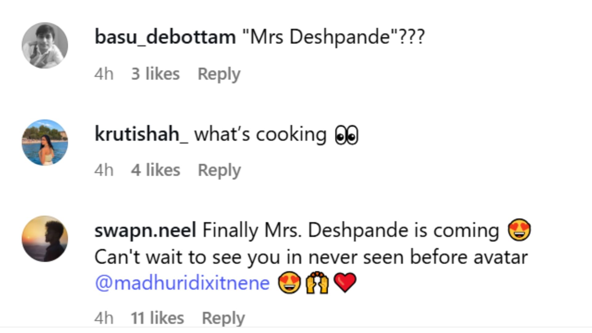 माधुरी की पोस्ट पर फैंस, सोशल मीडिया यूजर्स ने रिएक्शन दिया। एक यूजर्स ने लिखा, ‘हे भगवान, क्या हो रहा है।’ एक अन्य यूजर ने लिखा, ‘मिसेज देशपांडे।’ कुछ यूजर्स ने माधुरी के कई पुराने गाने कमेंट सेक्शन में लिखना शुरू कर दिया। बताते चलें कि मीडिया रिपोर्ट्स के अनुसार माधुरी दीक्षित डायरेक्टर नागेश कुकुनूर की एक फिल्म कर रही हैं। इस फिल्म की कहानी एक सीरियल किलर की बताई जा रही है। हो सकता है कि माधुरी इस फिल्म को लेकर क्रिप्टिक पोस्ट कर रही हैं।
