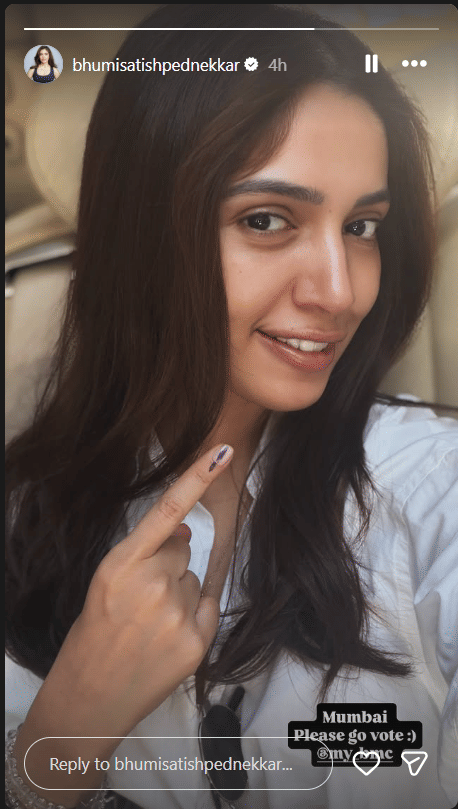भूमि पेडनेकर ने भी तमन्ना की तरह मतदान देने के बाद अपनी एक तस्वीर इंस्टाग्राम स्टोरी पर शेयर की। भूमि के चेहरे पर वोट डालने की खुशी साफ नजर आ रही है। इसी के साथ भूमि ने लिखा, 'मुंबई वालों जाओ और वोट डालो।'