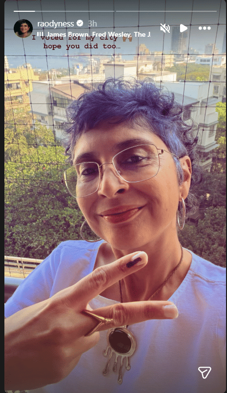 बॉलीवुड एक्टर आमिर खान की पूर्व पत्नी किरण राव ने भी मुंबई वासियों से वोट डालने की अपील की है। किरण ने इंस्टाग्राम स्टोरी पर अपनी एक तस्वीर शेयर की और कैप्शन में लिखा, 'मैंने अपने शहर (मुंबई) के लिए वोट दिया है, उम्मीद करती हूं आपने भी मतदान दिया होगा।'
