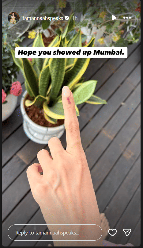 तमन्ना भाटिया ने भी एक जिम्मेदार नागरिक का फर्ज निभाते हुए अपना मतदान दिया। वोट डालने के बाद तमन्ना ने इंस्टाग्राम स्टोरी पर एक तस्वीर शेयर की, जिसमें उनका चेहरा नहीं दिखाई दे रहा है। लेकिन उंगली पर वोट डालने के बाद लगी इंक साफ दिखाई दे रही है। इस पोस्ट के साथ तमन्ना ने कैप्शन में लिखा, 'उम्मीद है मुंबई आप भी आए होंगे।'