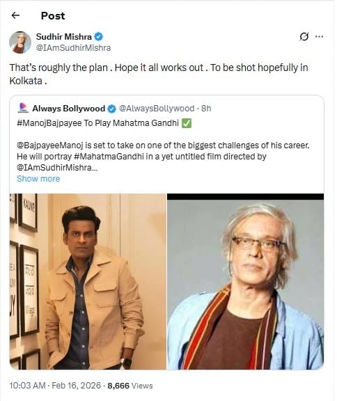 उन्होंने सोशल मीडिया पर एक पोस्ट शेयर किया। पोस्ट के जरिए उन्होंने साफ किया कि उनकी आने वाली बायोपिक में महात्मा गांधी का किरदार मनोज बाजपेयी निभाएंगे। कई हफ्तों से इस रोल को लेकर चर्चा चल रही थी, जो अब क्लियर हो गई है। सुधीर मिश्रा ने एक पोस्ट को री-शेयर किया जिसमें उनके साथ मनोज बाजपेयी नजर आ रहे हैं। इसमें लिखा है कि मनोज ही गांधी का रोल निभाएंगे। इसी पोस्ट को री-शेयर कर सुधीर ने लिखा, ‘लगभग यही प्लान है, उम्मीद है सब ठीक से हो जाएगा। कोलकाता में शूटिंग की उम्मीद है।' मनोज बाजपेयी राष्ट्रीय पुरस्कार विजेता अभिनेता हैं और अपने गहराई वाले किरदारों के लिए जाने जाते हैं। ऐसे में उनका गांधी की भूमिका में नजर आना अपने आप में एक बड़ी चीज है।