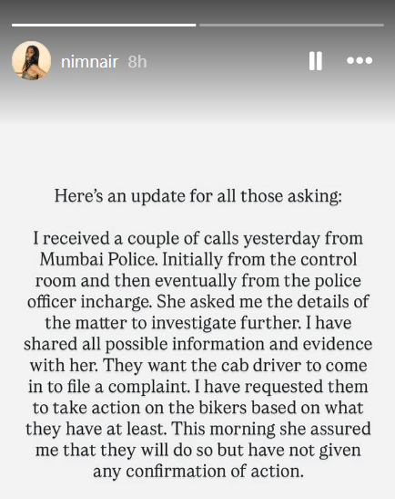 निमिषा ने आगे लिखा, 'पुलिस चाहती है कि कैब ड्राइवर खुद आकर शिकायत दर्ज करवाए। मैंने उनसे कहा कि आपके पास जो जानकारी है, उसी के आधार पर कम से कम बाइक वालों के खिलाफ कार्रवाई करें। आज सुबह उन्होंने मुझे भरोसा दिया कि वे ऐसा जरूर करेंगे। लेकिन अभी तक किसी कार्रवाई की कोई पक्की खबर नहीं मिली है।'