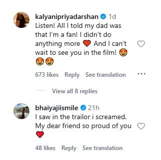 मिथिला की इस पोस्ट पर कल्याणी प्रियदर्शन ने कमेंट किया और कहा कि उन्होंने बस अपने पिता को बताया कि वे मिथिला की फैन हैं, और उससे ज्यादा कुछ नहीं किया। बता दें कि कल्याणी प्रियदर्शन भी एक्ट्रेस हैं, और साउथ की कई फिल्मों में नजर आ चुकी हैं।