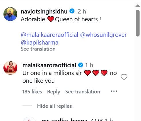 नवजोत सिंह सिद्धू का यह पोस्ट मलाइका ने अपनी इंस्टा स्टोरी पर साझा किया है। इसके अलावा उन्होंने कमेंट भी किया है। मलाइका ने लिखा है, 'आप लाखों में एक हैं सर। आप जैसा कोई नहीं'। इसके अलावा हरभजन सिंह ने भी मजाकिया अंदाज में पोस्ट पर कमेंट करते हुए लिखा है, 'पा जी कुछ गड़बड़ लग रही है मैनू। भाभी अमृतसर में याद कर रही हैं'।