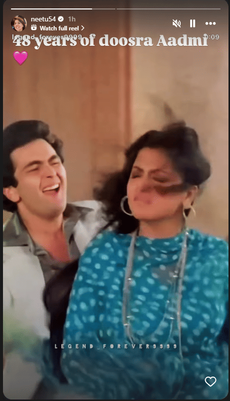 बॉलीवुड की प्यारी जोड़ी नीतू और ऋषि कपूर कई हिट फिल्मों में साथ दिखे। इनमें 1977 की फिल्म 'दूसरा आदमी' भी शामिल है। आज नीतू कपूर ने अपने सोशल मीडिया हैंडल की स्टोरी पर फिल्म 'दूसरा आदमी' के दो वीडियो शेयर किए हैं। आज इस फिल्म की रिलीज के पूरे 48 साल हो गए हैं।