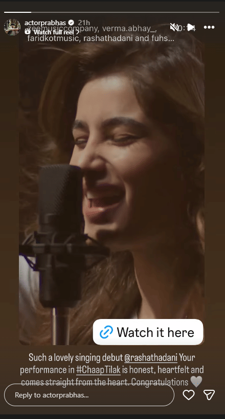 प्रभास ने अपनी इंस्टाग्राम स्टोरी में राशा थडानी का गाना 'छाप तिलक' शेयर किया और लिखा, 'वाह, शानदार शुरुआत राशा थडानी #ChaapTilak में तुम्हारा प्रदर्शन सच्चा, भावपूर्ण और दिल से निकला हुआ है। बधाई हो।' राशा ने अपनी इंस्टाग्राम स्टोरी पर प्रभास का आभार जताते हुए लिखा, 'प्रभास सर, मैं हमेशा आभारी रहूंगी।'