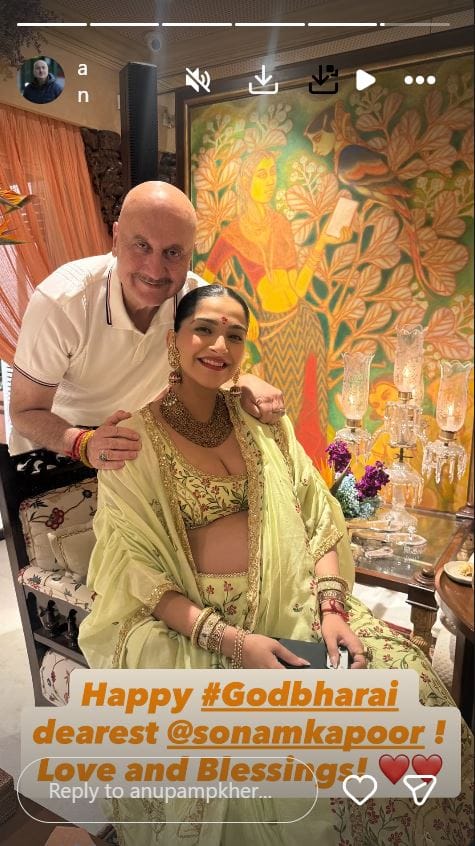 सोनम कपूर की गोदभराई में अभिनेता अनुपम खेर भी पहुंचे। उन्होंने सोनम कपूर की फोटो शेयर करते हुए उन्हें शुभकामना दी है। अनुपम खेर ने लिखा है, 'प्यारी सोनम तुम्हें गोदभराई की शुभकामनाएं। खूब प्यार और आशीर्वाद'। सोनम ट्रेडिशनल लुक में बेहद प्यारी लग रही हैं। हैवी ज्वैलरी से उन्होंने अपना लुक कंपलीट किया है। सोनम कपूर की गोदभराई के कार्यक्रम में डेकोरेशन भी खास की गई। फूलों से घर को सजाया गया।