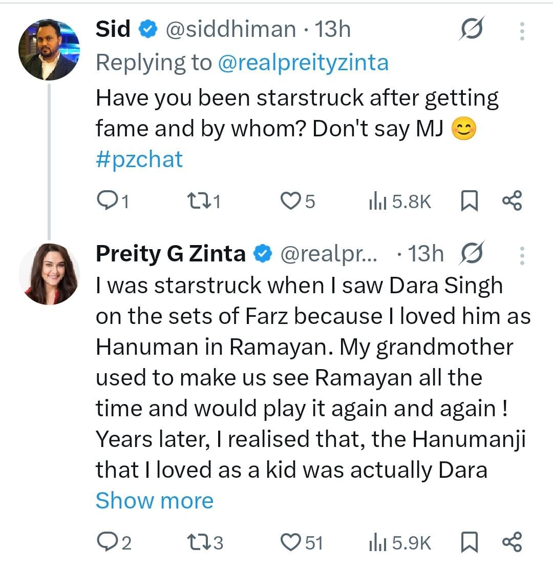 एक फैन ने प्रीति जिंटा से पूछा कि उनका फेवरेट एक्टर कौन है? इस सवाल के जवाब में प्रीति जिंटा ने जवाब दिया, ‘मैंने ‘फर्ज’ फिल्म के सेट पर दारा सिंह जी को देखा था। मैं उन्हें देखती ही रह गई थी। मेरी दादी बचपन में हमें रामायण दिखाती थीं। बाद में मुझे पता चला कि हनुमान जी का रोल दारा सिंह ने निभाया था। वह मेरे पसंदीदा एक्टर रहे हैं।’