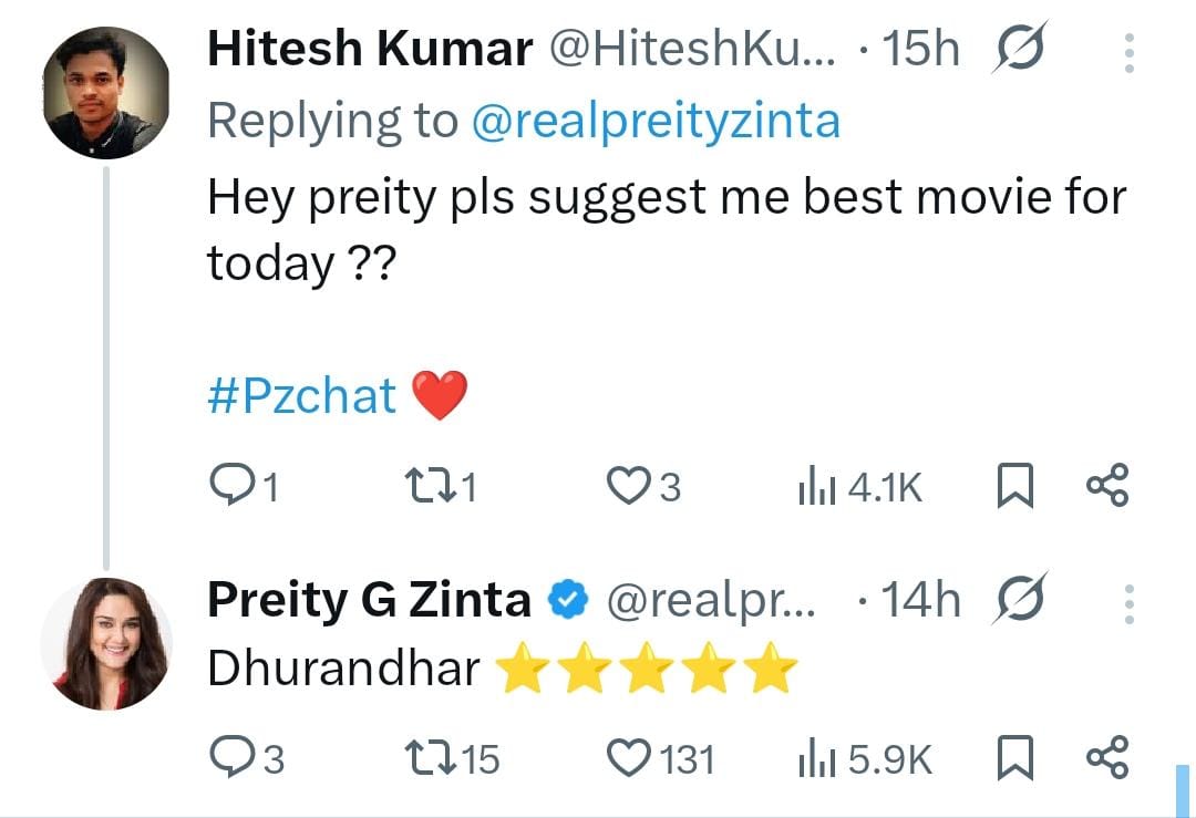 जब फैन ने अच्छी फिल्म सजेस्ट करने का सवाल किया तो प्रीति जिंटा ने ‘धुरंधर’ का नाम लिया। वह फिल्म को 5 स्टार भी देती हैं। इस तरह कहीं ना कहीं प्रीति जिंटा भी रणवीर सिंह स्टारर फिल्म की कायल हो चुकी हैं।