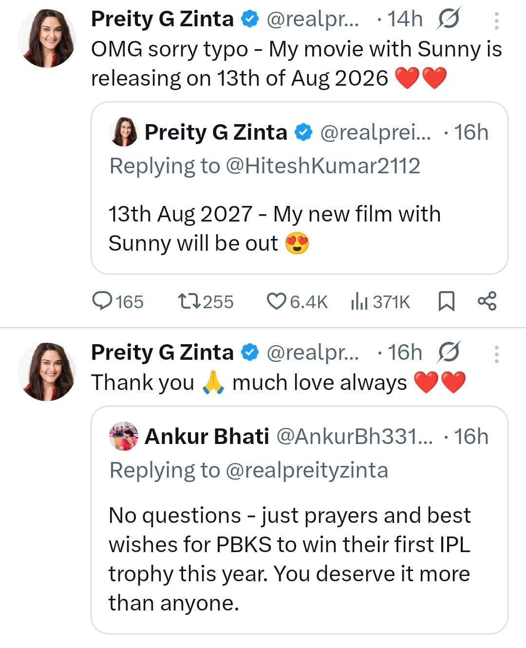 प्रीति जिंटा से फैन ने पूछा कि उन्हें क्रिकेट और फिल्मों में से किसी एक को चुनना पड़ा तो वह किसका चुनाव करेंगी। इस पर प्रीति जवाब देती हैं, ‘मैंने 18 साल पहले क्रिकेट को चुना था। इस साल दो फिल्मों में नजर आऊंगी। मैं सनी देओल के साथ एक फिल्म कर रही हूं। यह 13 अगस्त 2026 को रिलीज होगी।’
