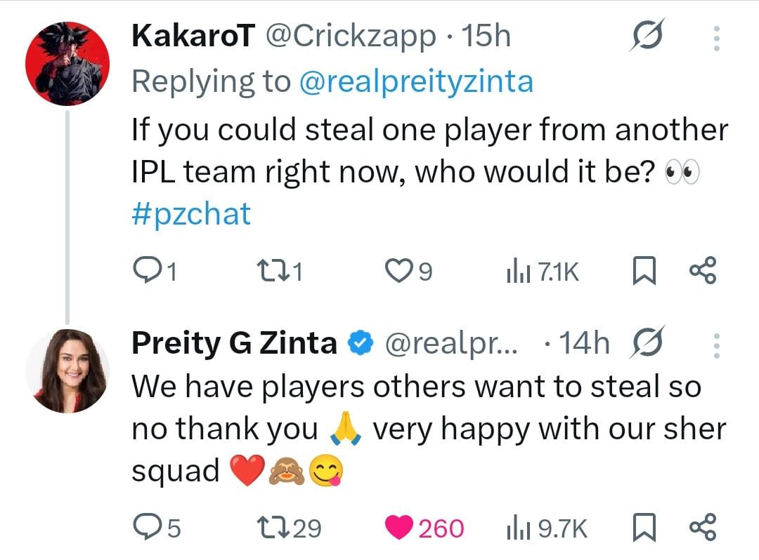 प्रीति जिंटा से फैन ने पूछा कि वह कौन टीम आईपीएल टीम का प्लेयर चुराना चाहिए? इस पर एक्ट्रेस ने जवाब दिया, ‘हमारे पास ऐसे प्लेयर हैं, जिन्हें लोग चुराना चाहेंगे। हमें किसी टीम का प्लेयर नहीं चाहिए। हम अपनी शेर टीम से काफी खुश हैं।’