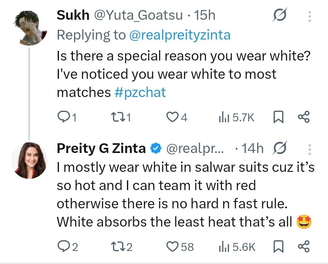 कुछ फैंस को लगता है कि प्रीति जिंटा हमेशा सफेद ड्रेस या सलवार-सूट में ही आईपीएल मैच के दौरान नजर आती हैं। शायद यह उनका लकी कलर है। लेकिन ऐसा कुछ नहीं है। प्रीति इस सवाल के जवाब में कहती हैं, ‘मैं ज्यादातर सेफद सूट सलवार इसलिए पहनती हूं क्योंकि मैच के दौरान काफ गर्मी होती है। मैं इस ड्रेस काे रेड कलर के साथ टीमअप करती हूं। वरना ऐसा कोई रूल नहीं है कि यही कलर पहनना है। बस सफेद रंग में गर्मी कम लगती है।’