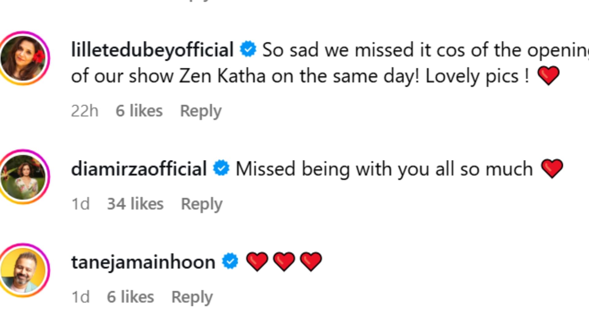 पृथ्वी फेस्टिवल से जुड़ी तस्वीरें देखकर दीया मिर्जा ने रिएक्शन दिया। वह पोस्ट के कमेंट सेक्शन में लिखती हैं, ‘मुझे आप सबके साथ न हो पाने की कमी महसूस हुई।’ दीया इस इवेंट में शामिल नहीं हो सकीं और वह दूसरे सेलेब्स के साथ को मिस करती दिखीं। इन दिनों दीया मिर्जा अपनी एक फिल्म की शूटिंग में व्यस्त हैं।