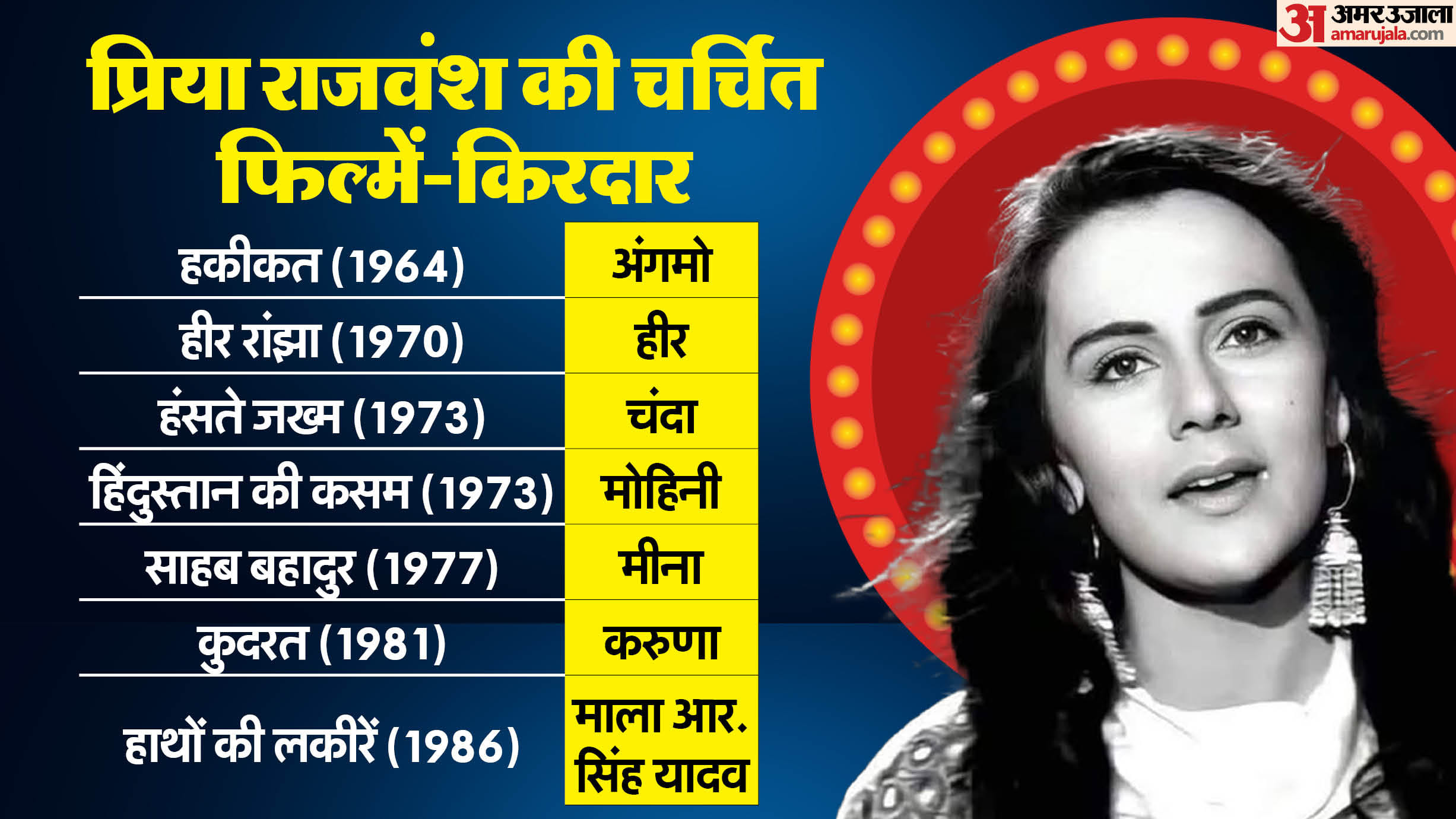 हिंदी सिनेमा में कुछ कलाकार ऐसे भी हुए, जिन्होंने चुनिंदा फिल्में कीं, लेकिन अपनी अदाकारी से दर्शकों का दिल जीत लिया। ऐसी ही एक अदाकारा थीं प्रिया राजवंश। 60 के दशक में अपना फिल्मी करियर शुरू करने वाली इस अभिनेत्री ने महज सात ही फिल्मों में काम किया। फिल्मी गलियारों में प्रिया राजवंश की अदाकारी की खूब चर्चा रही लेकिन एक दिन इनकी हत्या की खबर मिली। बॉलीवुड के लिए यह खबर किसी सदमे से कम नहीं थी। आज अभिनेत्री प्रिया राजवंश की पुण्यतिथि (27 मार्च 2000) है। इस मौके पर जानिए, इस अदाकारा के फिल्म करियर और निजी जीवन से जुड़ी बातें।