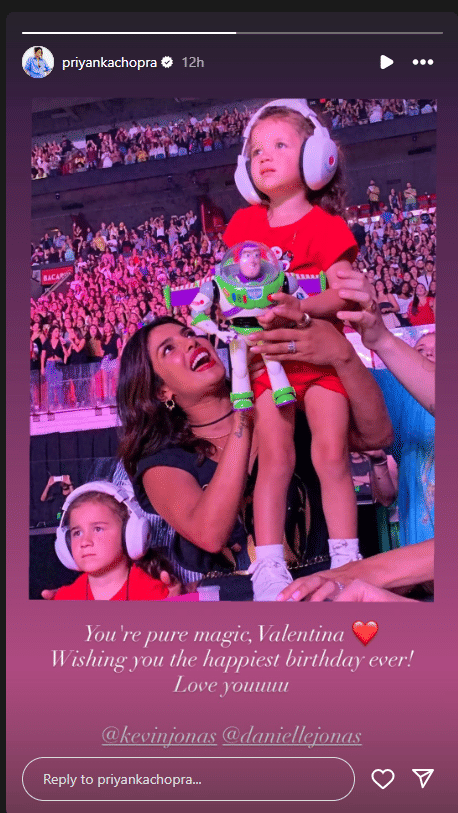 प्रियंका ने इंस्टाग्राम स्टोरी पर वैलेंटिना के साथ एक प्यारी तस्वीर शेयर की, जिसमें वे वैलेंटिना को गोद में लिए हुए मुस्कुराती हुई नजर आ रही हैं। वैलेंटिना ने कान बंद करने वाले हेडफोन पहने हुए हैं और हाथ में बज लाइटईयर खिलौना पकड़ा है। यह तस्वीर जोनस ब्रदर्स के कॉन्सर्ट के दौरान की है। इस तस्वीर के साथ प्रियंका ने कैप्शन में लिखा, 'तुम जादू हो वैलेंटिना। जन्मदिन मुबारक।' इस प्यारी तस्वीर के साथ प्रियंका ने केविन और डैनियल को टैग किया और कहा, 'मैं तुमसे प्यार करती हूं।'
