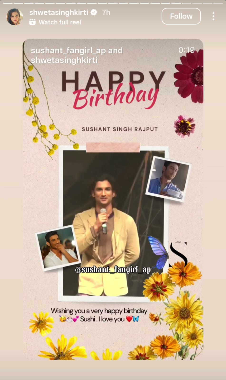 सुशांत सिंह राजपूत की बहन श्वेता ने भी आज अपने भाई को याद किया। फैंस ने सुशांत की बर्थ एनिवर्सरी पर जो पोस्ट शेयर की, उन्हें श्वेता ने अपने इंस्टाग्राम पेज के स्टोरी सेक्शन में पोस्ट किया है। सुशांत की बातों और यादों को श्वेता ने संजोकर रखा है।