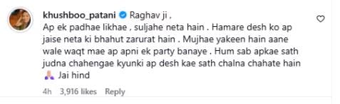 इन सब के बीच एक्ट्रेस दिशा पाटनी की बहन खुशबू पाटनी का रिएक्शन भी सामने आया है। उन्होंने राघव की पोस्ट पर कमेंट करते हुए लिखा, ‘राघव जी, आप एक पढ़े लिखे, सुलझे नेता हैं। हमारे देश को आप जैसे नेता की बहुत जरूरत है। मुझे यकीन है आने वाले वक्त में आप अपनी एक पार्टी बनाएं। हम सब आपके साथ जुड़ना चाहेंगे, क्योंकि आप देश के साथ चलना चाहते हैं। जय हिंद।