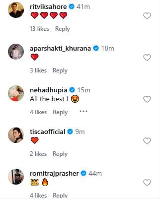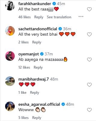 पोस्ट शेयर करने के बाद बॉलीवुड सेलेब्स ने भी एक्टर को उनके प्रोजेक्ट के लिए शुभकामनाएं दी हैं। फराह खान, नेहा धूपिया और सचेत टंडन ने पोस्ट पर ‘ऑल द बेस्ट’ कमेंट किया। वहीं ऋत्विक साहोरे, अपारशक्ति खुराना और ईशा अग्रवाल ने भी एक्टर की पोस्ट पर कमेंट कर बधाई दी।