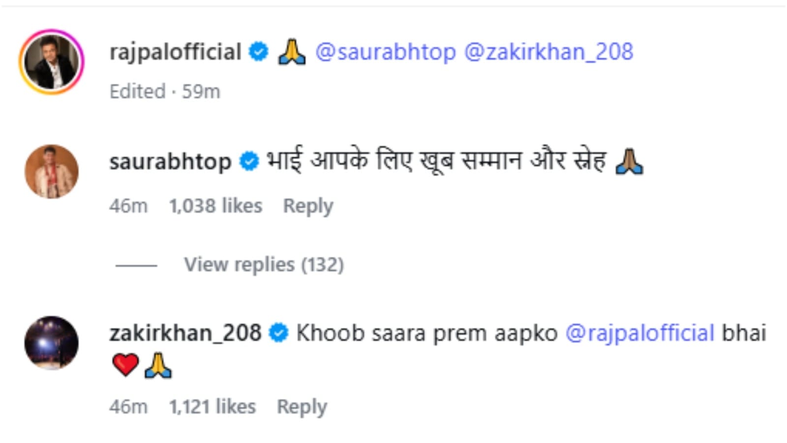 राजपाल ने आगे जाकिर खान और सौरभ द्विवेदी को अपना जिगरी दोस्त बताते हुए लिखा है कि उनका दिल मत दुखाइए। वे दोनों मेरे छोटे भाई जैसे हैं। उन्होंने हमेशा सम्मान किया है। व्यर्थ में इनकी निंदा करके दिल मत दुखाइए। इनका दिल दुखाने से मेरा दिल दुखेगा। राजपाल यादव के इस पोस्ट पर जाकिर खान और सौरभ ने भी टिप्पणी की है और एक्टर का आभार जताया है।