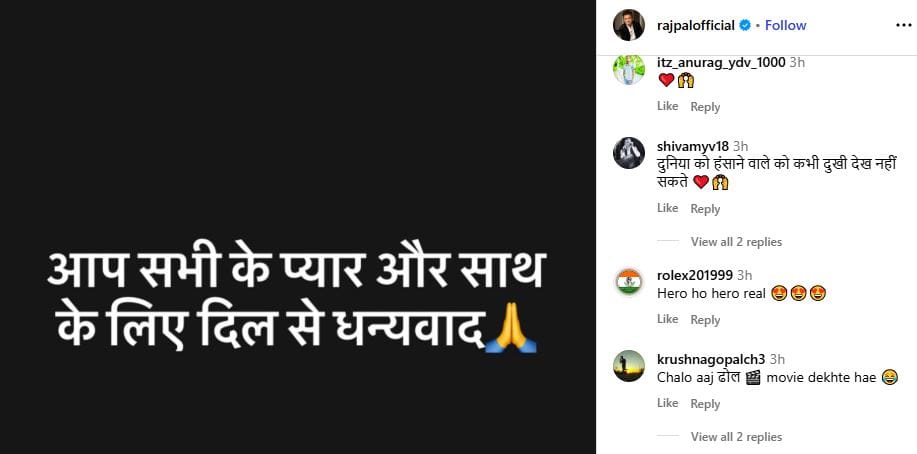 अभिनेता राजपाल यादव कल मंगलवार को तिहाड़ से रिहा हो गए। उन्होंने सोशल मीडिया पर पोस्ट कर इंडस्ट्री और फैंस का सपोर्ट करने के लिए आभार जताया है। लेकिन उनकी इस पोस्ट पर लोगों के अच्छे-बुरे, दोनों तरह के रिएक्शन सामने आए हैं।