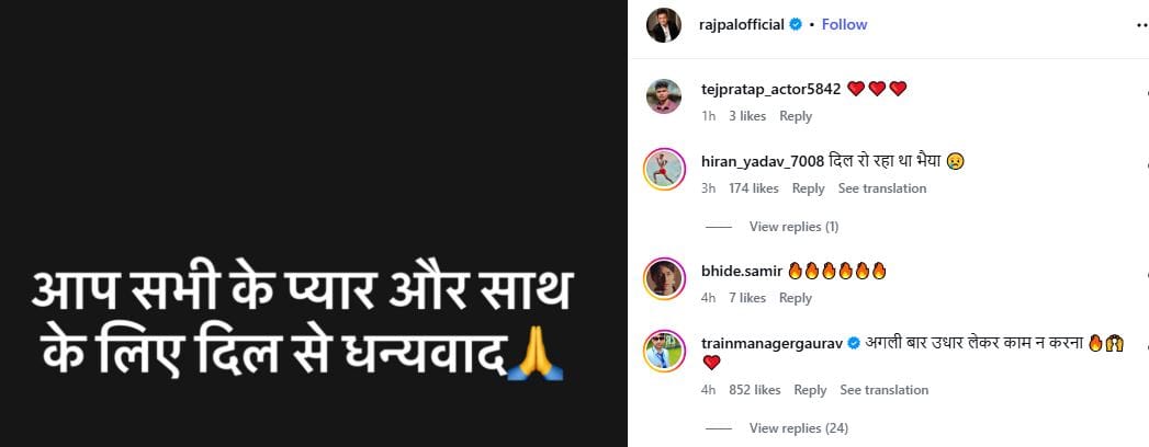 Rajpal Yadav: चेक बाउंस मामले में जमानत पर जेल से रिहा हुए फिल्म अभिनेता राजपाल यादव ने सोशल मीडिया पर लोगों का शुक्रिया अदा किया है। उनके इस पोस्ट पर लोगों की मिला-जुला रिएक्शन सामने आ रहा है।