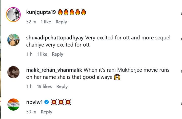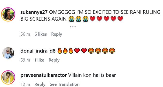 रानी मुखर्जी के फर्स्ट लुक पोस्टर पर नेटिजन्स के कमेंट्स आ रहे हैं। यूजर्स फिल्म को लेकर अपना उत्साह जगा रहे हैं। एक यूजर ने लिखा, 'रानी मुखर्जी बड़े पर्दे पर राज करने फिर लौट रही हैं'। एक अन्य यूजर ने लिखा, 'रिलीज डेट का बेसब्री से इंतजार है'। एक अन्य यूजर ने लिखा है, 'बहुत समय से इसका इंतजार था'। 'मर्दानी' फ्रेंचाइजी की पहली फिल्म साल 2014 में आई थी। इसका दूसरा पार्ट यानी 'मर्दानी 2' साल 2019 में रिलीज हुई। दोनों फिल्मों को काफी पसंद किया गया। अब देखना दिलचस्प होगा कि तीसरा पार्ट क्या कमाल करता है?