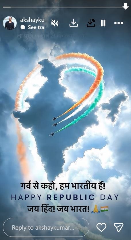 गणतंत्र दिवस के अवसर पर बॉलीवुड के खिलाड़ी अक्षय कुमार ने इंस्टाग्राम स्टोरी पर पोस्ट शेयर कर बधाई दी है। उन्होंने लिखा है, 'गर्व से कहो, हम भारतीय हैं'।