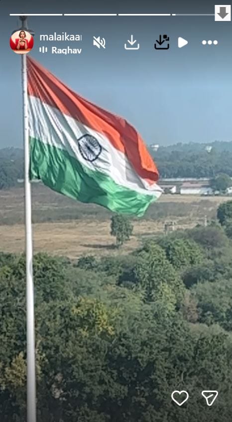अभिनेत्री मलाइका अरोड़ा ने आज गणतंत्र दिवस के अवसर पर अपनी इंस्टाग्राम स्टोरी पर तिरंगे की तस्वीर शेयर की है।