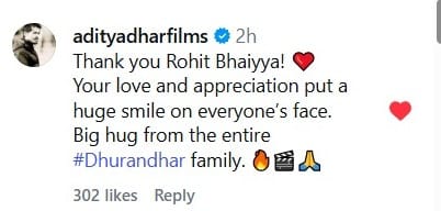 रोहित शेट्टी के पोस्ट पर आदित्य धर ने रिएक्शन देते हुए शुक्रिया अदा किया है। उन्होंने लिखा है, 'थैंक्यू रोहित भैया। आपके इस प्यार और तारीफ ने पूरी टीम के चेहरे पर मुस्कान ला दी है। फिल्म 'धुरंधर' की पूरी टीम की तरफ से झप्पी'।