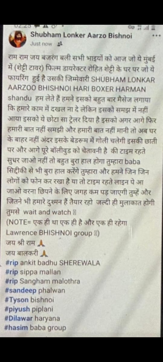 आगे अपनी पोस्ट में शुभम लोनकर लिखता है, ‘टाइम रहते सुधर जाओ, नहीं तो बहुत बुरा हाल होगा, तुम्हारा बाबा सिद्दीकी से भी बुरा हाल करेंगे। हमने जिन जिन लोगों को फोन किया है, टाइम रहते लाइन पर आ जाओ, वरना छिपने के लिए जगह कम पड़ जाएगी। तुम्हें और जितने भी हमारे दुश्मन हैं, तैयार रहो। जल्दी ही मुलाकात होगी, तुमसे।’