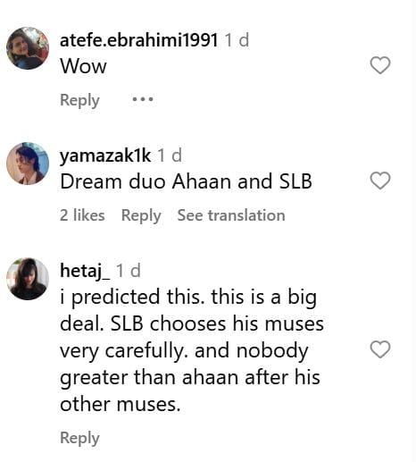 अहान पांडे के फैंस क्रेजी हो रहे हैं कि क्या वे भंसाली के साथ फिल्म करने वाले हैं? नेटिजन्स लिख रहे हैं, 'अहान और भंसाली...अगर वाकई दोनों साथ आते हैं तो कुछ धमाल होगा'। एक यूजर ने लिखा, 'अगर अहान और संजय लीला भंसाली साथ काम करते हैं तो यह एक बड़ी डील होगी।'