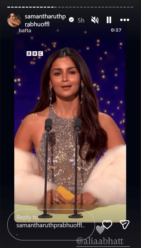 आलिया भट्ट के बाफ्टा के मंच पर हिंदी बोलने का अंदाज हर किसी को भा रहा है। फैंस जहां आलिया पर प्यार लुटा रहे हैं और उन पर गर्व जता रहे हैं। वहीं अब साउथ की दिग्गज अभिनेत्री सामंथा रुथ प्रभु ने भी आलिया का सपोर्ट किया है और उनके लिए चीयर किया है। सामंथा ने अपने इंस्टाग्राम की स्टोरी पर आलिया का हिंदी बोलते हुए वीडियो साझा किया है। इसके साथ ही उन्होंने आलिया को मेंशन करके व्हाइट हार्ट भी बनाया है। हालांकि, उन्होंने आलिया के लिए और कुछ नहीं कहा, लेकिन सामंथा का ये सपोर्ट दोनों स्टार्स की बॉन्डिंग को दर्शाता है।