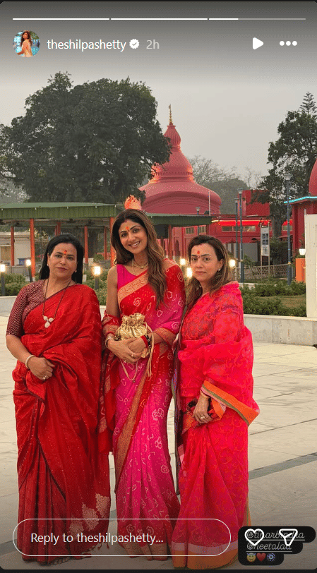 एक तस्वीर में शिल्पा अपनी दो दोस्तों के साथ खड़ी हैं। तीनों ने खूबसूरत पारंपरिक साड़ियां पहनी हुई थीं। शिल्पा ने चमकीले गुलाबी रंग की सुनहरे काम वाली साड़ी पहनी हुई है, जिसमें हल्के गहने और बिंदी लगाई हुई थी। वह मंदिर के पास पोज देती नजर आ रही हैं।