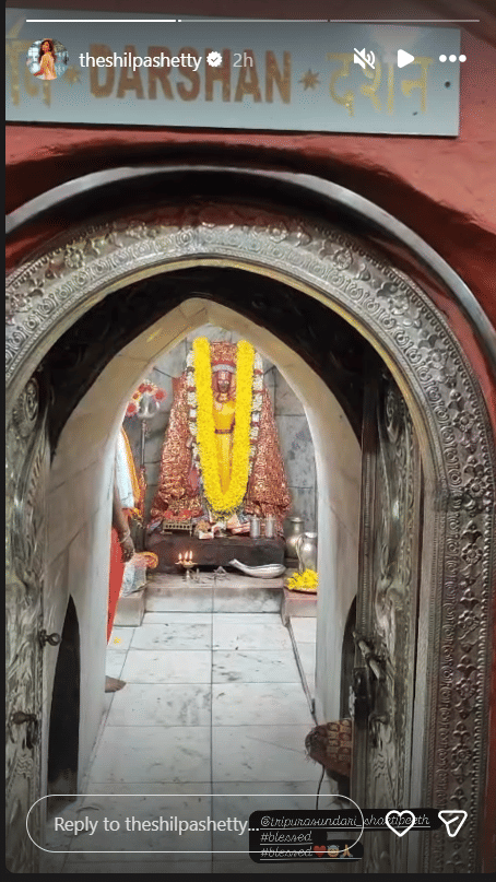 शिल्पा ने इंस्टाग्राम स्टोरी पर मंदिर से अपनी तस्वीरें और वीडियो शयर किए हैं। इनमें शिल्पा मंदिर में पूजा-अर्चना करती हुई दिखाई दे रही हैं। शिल्पा की इन तस्वीरों और वीडियो को देखकर फैंस बेहद खुश हैं। एक वीडियो में शिल्पा देवी त्रिपुरासुंदरी की मूर्ति के सामने पूजा करती नजर आ रही हैं। एक वीडियो में मंदिर के गर्भगृह की सुंदर झलक भी दिखाई गई है।