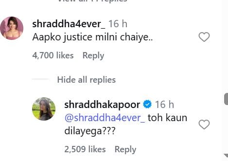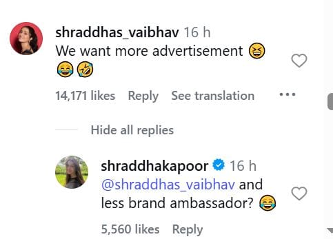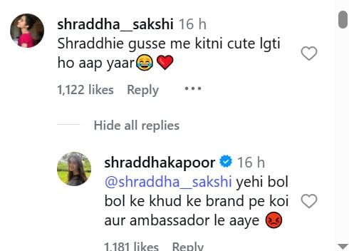 इस पोस्ट के साथ श्रद्धा ने कैप्शन लिखा है, 'मैं कहां गुस्सा हूं? मैं तो बेहद खुश हूं। भला अमृता राव से परफेक्ट कौन है मंगलसूत्र रेंज के लिए'। एक्ट्रेस के पोस्ट पर नेटिजन्स के मजेदार कमेंट आ रहे है। एक यूजर ने लिखा, 'आपको न्याय मिलना चाहिए'। इस पर श्रद्धा ने लिखा, 'तो कौन दिलाएगा'? एक यूजर ने लिखा, 'श्रद्धा गुस्से में कितनी क्यूट लगती हैं'। इस पर उन्होंने कहा, 'यही बोल बोलकर खुद के ब्रांड पर कोई और एंबेसडर ले आए'। एक यूजर ने लिखा, 'हमें ऐसे और एड वीडियो देखने हैं'। इस पर श्रद्धा कहती हैं, 'और ब्रांड एबेंसडर कम हों'?