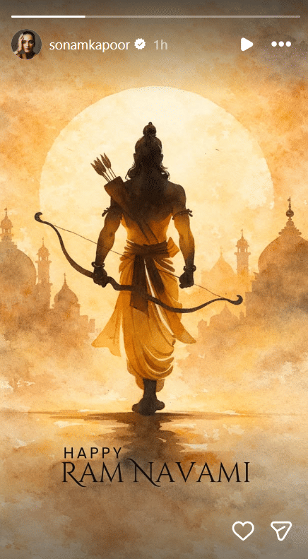 बॉलीवुड अभिनेत्री सोनम कपूर ने अपने सभी फैंस को रामनमवी की शुभकामनाएं दी हैं। सोनम ने इंस्टाग्राम स्टोरी पर एक प्यारा पोस्टर शेयर किया, जिसमें भगवान राम की तस्वीर नजर आ रही है। इसके साथ सोनम ने कैप्शन में लिखा 'हैप्पी रामनवमी'।
