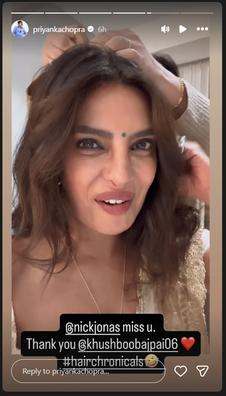 ग्लोबल स्टार प्रियंका चोपड़ा इन दिनों अपनी आगामी फिल्म 'वाराणसी' को लेकर लगातार सुर्खियों में बनी हुई हैं। इस फिल्म का एक खास इवेंट ग्लोबट्रॉटर के नाम से हैदराबाद में आयोजित किया गया। जिसके दौरान प्रियंका ने अपने देसी लुक से सभी का दिल जीत लिया। वहीं इसी बीच आज प्रियंका ने अपनी इंस्टाग्राम स्टोरी पर एक प्यारा वीडियो शेयर किया, जिसमें उनकी हेयर स्टाइलिस्ट खुशबू बाजपेयी उनके हेयर को स्टाइल देती नजर आ रही हैं। इस वीडियो को शेयर करते हुए प्रियंका किसी को याद करती नजर आईं।