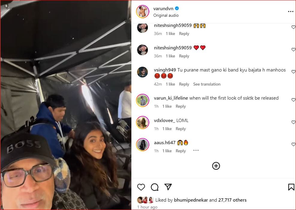 वरुण धवन ने इंस्टाग्राम पर अपना एक खास वीडियो फिल्म 'है जवानी तो इश्क होना है' का शेयर कर फैंस को खुश कर दिया है। इस वीडियो में वरुण फिल्म के सेट की शूटिंग का नजारा दिखाते हुए तुफान की जानकारी देते हैं। इसके बाद वरुण सेट के सभी सदस्यों से बात करते नजर आए। पूजा हेगड़े से लेकर पूरी टीम खाना खाती नजर आई, खाने के जायके का स्वाद कैसा लगा, इसका जवाब वरुण ने उनसे पंजाबी में मांगा।