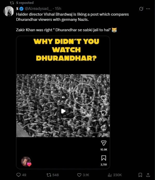‘धुरंधर 2’ फिल्म इन दिनों बॉक्स ऑफिस पर धमाल मचा रही है। इसे लोगों से खूब प्यार मिल रहा है। फिल्म ने बॉक्स ऑफिस पर रिकॉर्ड तोड़ कमाई की है। लेकिन शायद फिल्म को लेकर विशाल भारद्वाज की राय अलग है। उन्होंने सोशल मीडिया पर इससे जुड़ी एक ऐसी पोस्ट पर लाइक कर दिया कि लोग अब उन्हें ‘धुरंधर’ फिल्म के विरोधी बता रहे हैं।