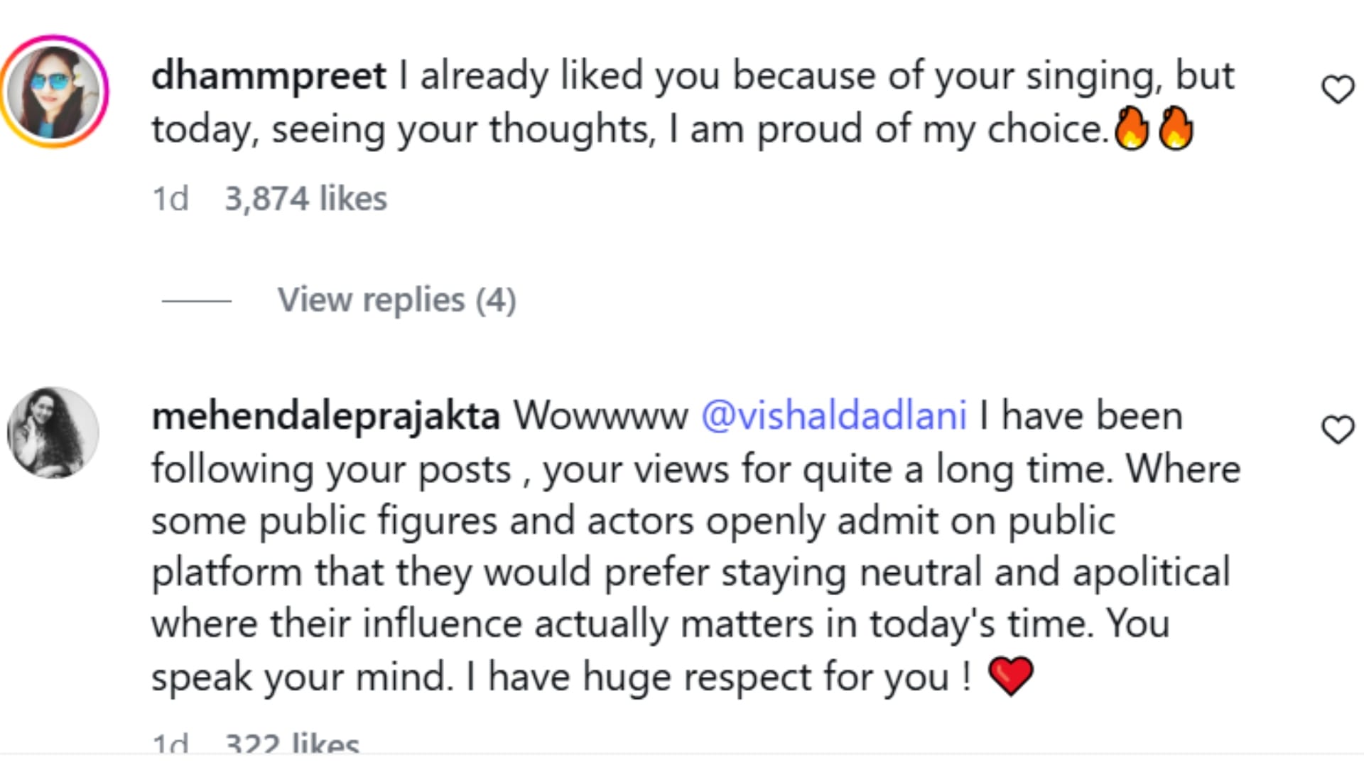 विशाल ने जिस मुखरता से अपनी बात को रखा है, उससे सोशल मीडिया यूजर्स भी काफी इंप्रेस हुए। एक यूजर ने लिखा, ‘मैं आपको पहले से ही आपकी सिंगिंग की वजह से पसंद करता थी, लेकिन आज आपके विचार देखकर मुझे अपनी पसंद पर प्राउड हो रहा है।’ एक अन्य यूजर ने लिखा, ‘मैं काफी समय से आपके पोस्ट, आपके थॉट्स फॉलो कर रही हूं। जहां कुछ पब्लिक फिगर और एक्टर पब्लिक प्लेटफॉर्म पर खुलेआम मानते हैं कि वे न्यूट्रल और अपॉलिटिकल रहना पसंद करेंगे। लेकिन आप अपने मन की बात कहते हैं। मेरे मन में आपके लिए बहुत इज्जत बढ़ गई है।’ कई लोगों ने कहा कि विशाल को ऐसे ही अपनी आवाज उठाते रहना चाहिए।