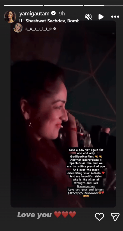 यामी की बहन सुरीली ने लिखा, 'एक बार फिर आदित्य धर फिल्म्स को सलाम। शानदार फिल्म। हमें आप पर बहुत गर्व है। और मेरी प्यारी बहन यामी, जो मेरी ताकत है। आप सभी को ढेर सारा प्यार। अब पार्टी करते हैं।' यामी ने इस पोस्ट को शेयर करते हुए लिखा, 'लव यू।'