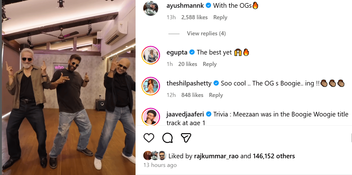 वीडियो के अंत में सभी ने ‘बूगी वूगी’ का मशहूर सिग्नेचर स्टेप किया। प्रशंसकों ने 'ओजी डांस क्रू' की एकमत से प्रशंसा की। वीडियो पर कमेंट करते हुए अभिनेत्री शिल्पा शेट्टी ने लिखा, ‘बहुत बढ़िया। ओजी बूगी... कर रहे हैं।’ आयुष्मान खुराना ने लिखा, ‘ओजी के साथ।’ अभिनेत्री ईशा गुप्ता ने लिखा, 'अभी तक का सबसे अच्छा, वीडियो।'