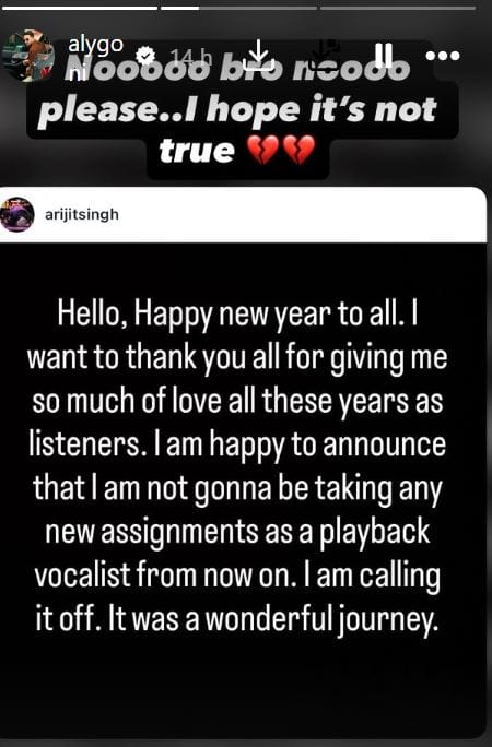 सिंगर उदित नारायण ने भी स्क्रीन से बात करते हुए अपना रिएक्शन दिया। उन्होंने कहा, 'अरिजीत ने बहुत कम समय में बहुत अच्छा काम किया। अवॉर्ड, इनाम, शोहरत, पैसा और स्टेज का क्रेज, उसने यह सब अपने सबसे अच्छे रूप में देखा। अगर वह रिटायर होना चाहता है तो यह उसका फैसला है, लेकिन वह संगीत नहीं छोड़ेगा। यह उसकी मर्जी है, लेकिन उसका काम लोगों के दिलों में बस गया है और हमेशा रहेगा'।