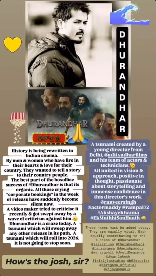 नोट में आगे लिखा है 'हाल ही में एक वीडियो मेकर ने इसकी आलोचना करने की कोशिश की और खुद ही आलोचना की लहर में बह गया। धुरंधर आज एक क्रेज है। एक ऐसी सुनामी जो अपने रास्ते में आने वाली किसी भी दूसरी रिलीज को बहा ले जाएगी। एक ऐसी सुनामी जो 2026 तक चलेगी। यह जल्द रुकने वाली नहीं है।'