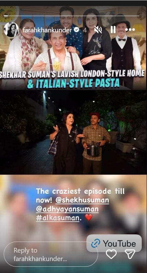 फराह खान के लिए शेखर सुमन ने इटैलियन स्टाइल पास्ता आलियो-ओलियो बनाया। फनी मूमेंट तब हुआ, जब शेखर सुमन ने कुक दिलीप से यह नाम बुलवाया और वह असफल रहे। फराह खान ने अपनी इंस्टाग्राम स्टोरी पर व्लॉग का लिंक शेयर करते हुए लिखा है, 'अब तक का सबसे क्रेजी एपिसोड। शेखर सुमन, अध्ययन और अलका सुमन से बातचीत शानदार रही'।